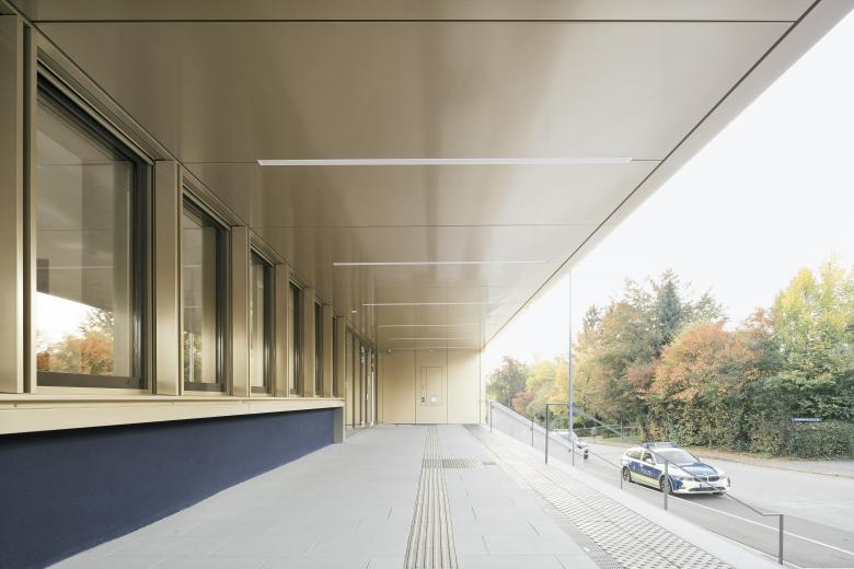 Die Fassade wird von horizontalen, über Eck laufenden Fensterbändern und messingfarbenen Lamellen gegliedert. Durch das Zusammenspiel der horizontalen Fassadenstruktur mit dem vertikal verlaufenden Rillenputz in Nachtblau entsteht das charakteristische und zurückhaltende Erscheingungsbild des Polizeiämtergebäudes.