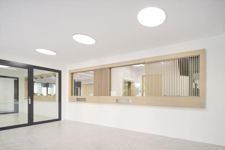 Maßstäblichkeit und Ausformung des Neubaukomplexes, der fünf Dienststellen an einem Standort zusammenführt, entsprechen dabei seiner übergeordneten Bedeutung. Die Baukörper gehen mit ihrer Höhenstaffelung einen optisch spannungsvollen Dialog mit dem Geländegefälle des langgezogenen, leicht geknickten Grundstücks ein und werden so auch zu einer zeichenhaften Baufigur zusammengebunden. Eine Freitreppe führt zu einem adressbildenden Unterschnitt, wo sich der Haupteingang befindet. Im Hauptgebäude sind die Räumlichkeiten der fünf Polizeidienststellen (Polizeiinspektion, Kriminialinspektion mit der neuen Abteilung Cybercrime, Grenzpolizeiinspektion, zentrale Einsatzdienste, technische Einsatzdienste) sowie die zentralen Räume für den Polizeibetrieb zoniert angeordnet. Der öffentlich zugängliche Bereich befindet sich im Erdgeschoss. Zwei Höfe gliedern das Gebäude und belichten die Innenräume; einer dient auch als Aufenthaltsfläche für das Personal. Die Kantine sowie Stellplätze für Dienst-, Einsatz- und Besucherfahrzeuge sind im Nebengebäude angeordnet.