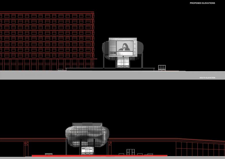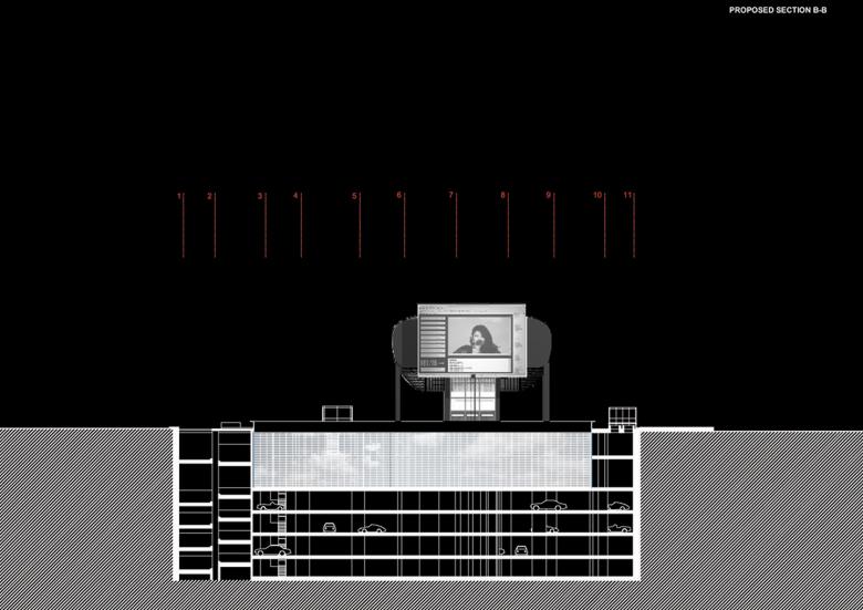 The 9-meter-deep void facing the theater remains from the interrupted construction of a new tower in the late 1990’s, to become another essential element in our intervention. The surface perimeter of the 9 meters of high space will extend to the floor as a continuous canvas to display video installation projections. The visitors will inhabit the gigantic image that will fill the void. The prosthesis, a 16.8-by-11.3-meter screen, will be placed onto the amputated southern facade of the theater shell. The proposed screen will project the cyber-interface of the new “city center”. Beyond its spectacular physical exposure in Downtown Beirut, the new city center will also be a major electronic portal monitored along a network of points constituting an alternative journey through the World Wide Web. This network of electronic space will feature new types of exhibitions, performances, concerts and interactive events all accessible via the city center’s internet portal. This alternative site could potentially become a highly visited address and an important meeting point that will link the physical city to the virtual community. Building interventions and instruments are being developed around such types of spaces. The planning of the edifice will not only be organized according to a physical perception of the space but it will also be developed around the sequential frames and the logic of the new electronic space.