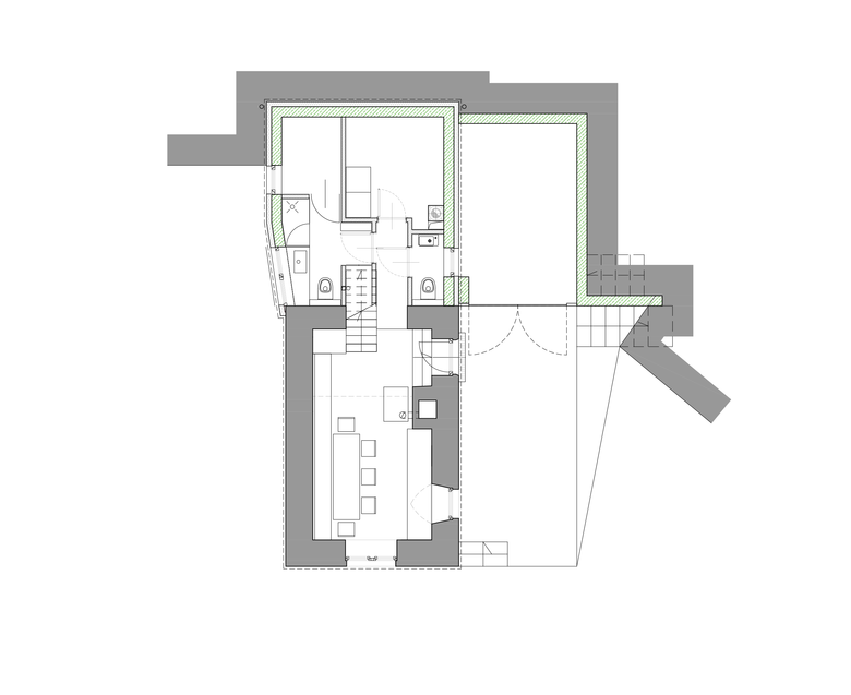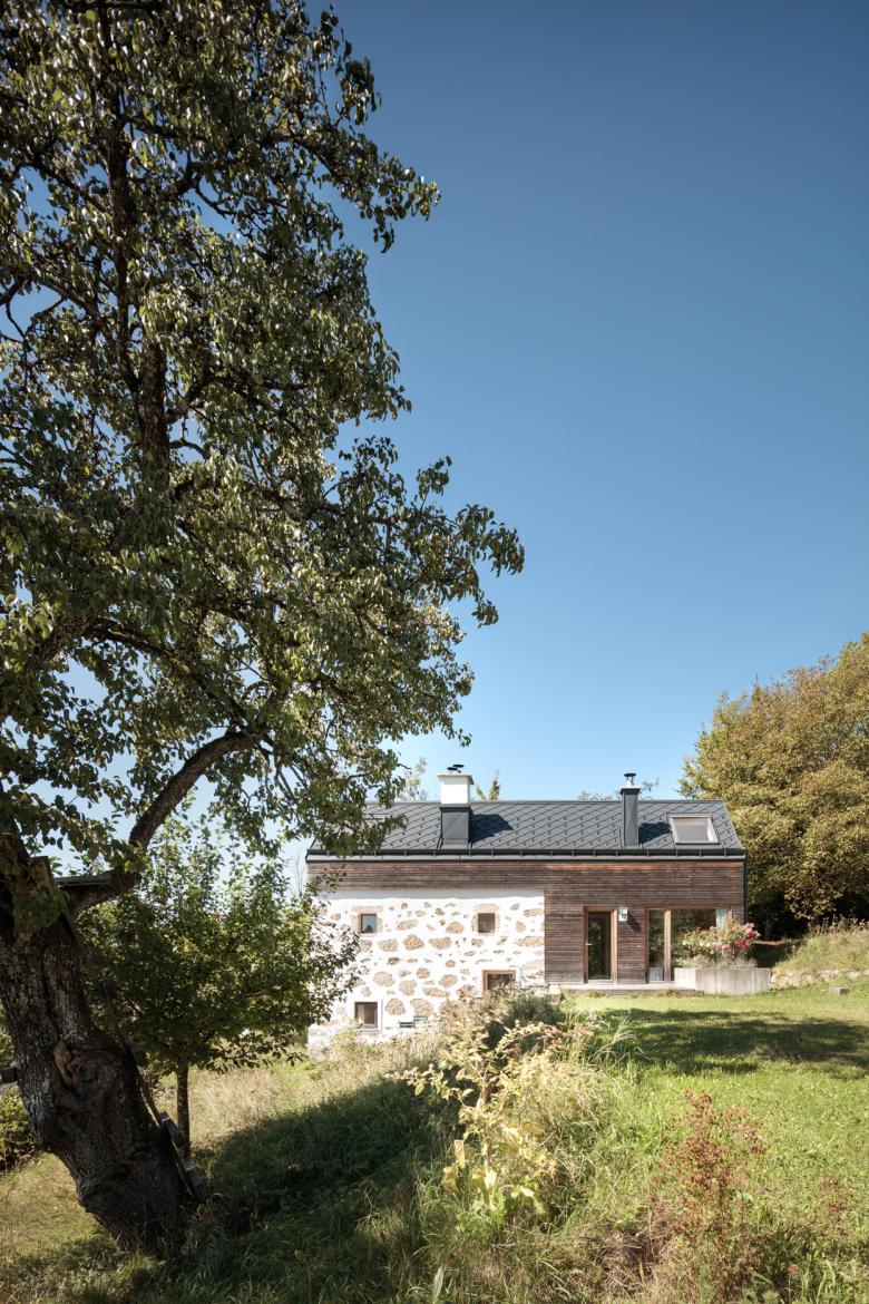 Nachdem das Grundstück 2010 an das öffentliche Kanalnetz und das Ortswasser angeschlossen wurde, fiel die Entscheidung zu einem umfangreichen Umbau. Die Zubauten aus den 1920er Jahren sowie der Dachstuhl waren in sehr schlechtem Zustand und wurden entfernt. Beibehalten wurden lediglich die aus dem 18. Jhd. stammenden Steinmauern. An der Nordseite mussten mehrere große Felsen gesprengt werden, um dort einen teilweise in den Hang eingegrabenen Keller betonieren zu können. Auf diesem wurde dann der Holzbau errichtet. Die Wandelemente sind vorgefertigte Pfosten-Riegel-Konstruktionen mit beidseitiger Beplankung und dazwischenliegender Wärmedämmung. Die Zwischendecke zwischen OG und DG ist eine Brettsperrholzdecke. Da auch für den Dachstuhl vorgefertigte Elemente verwendet wurden, konnte der gesamte Holzbau mit dichter Hülle innerhalb einer Woche errichtet werden. Bei der Dachkonstruktion handelt es sich um ein Sparrendach mit hinterlüfteter Blechdeckung (Prefa-Falzschablone). Die Fassade wurde mit horizontalen unbehandelten Lärchenlatten ausgeführt. Fenster und Außentüren sind aus geölter Lärche. Auch im Innenausbau (der zu einem großen Teil durch die Besitzer erfolgte) wurde viel Holz verwendet. Die Fußböden im alten Teil sind Lärche und im Zubau Tanne. Teilweise wurde Holz in Form von großformatigen Furnierplatten auch als Oberfläche der Innenwände eingesetzt. Die nordseitige Wand wurde innenseitig mit Lehmbauplatten beplankt. Beheizt wird das Haus mittels