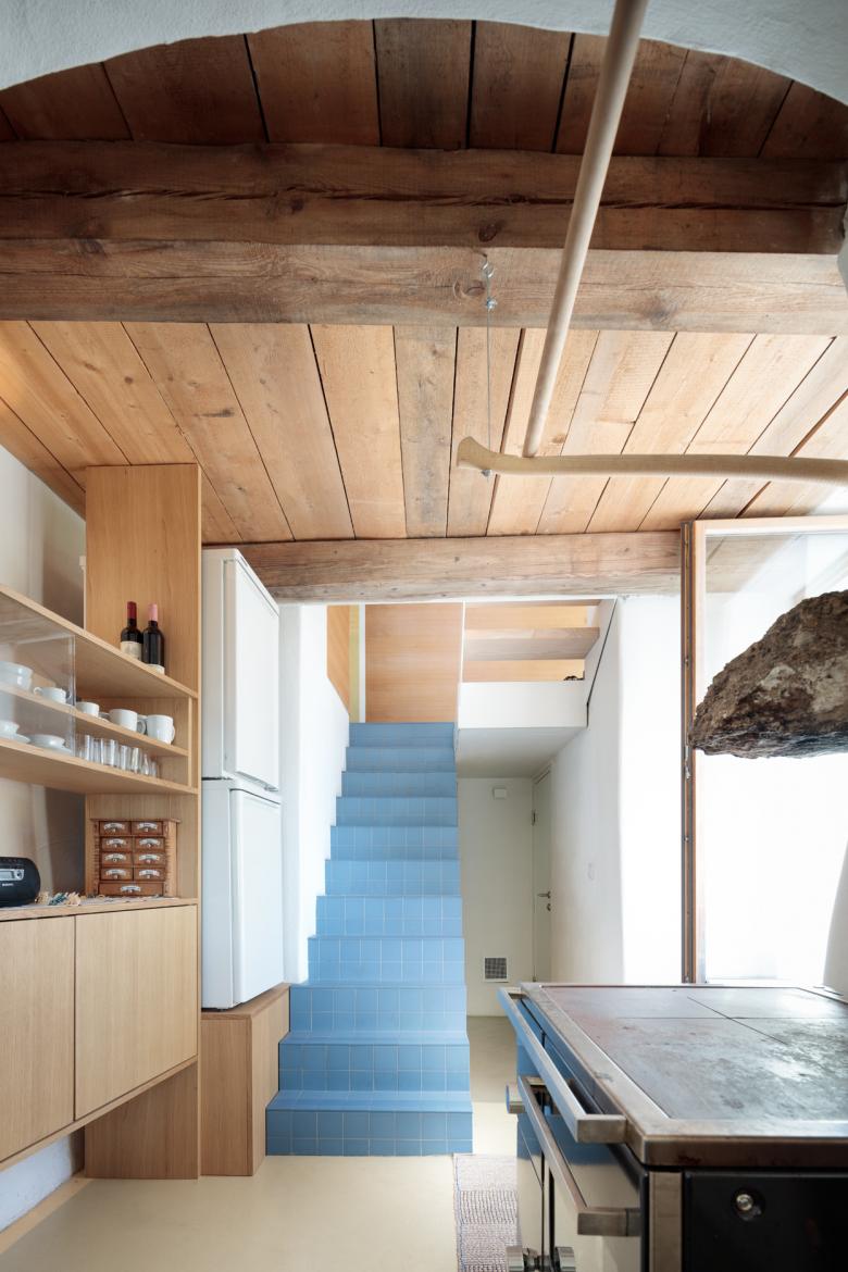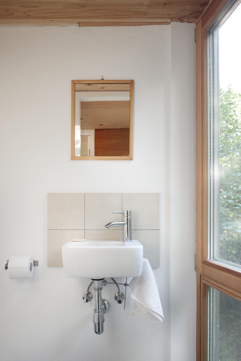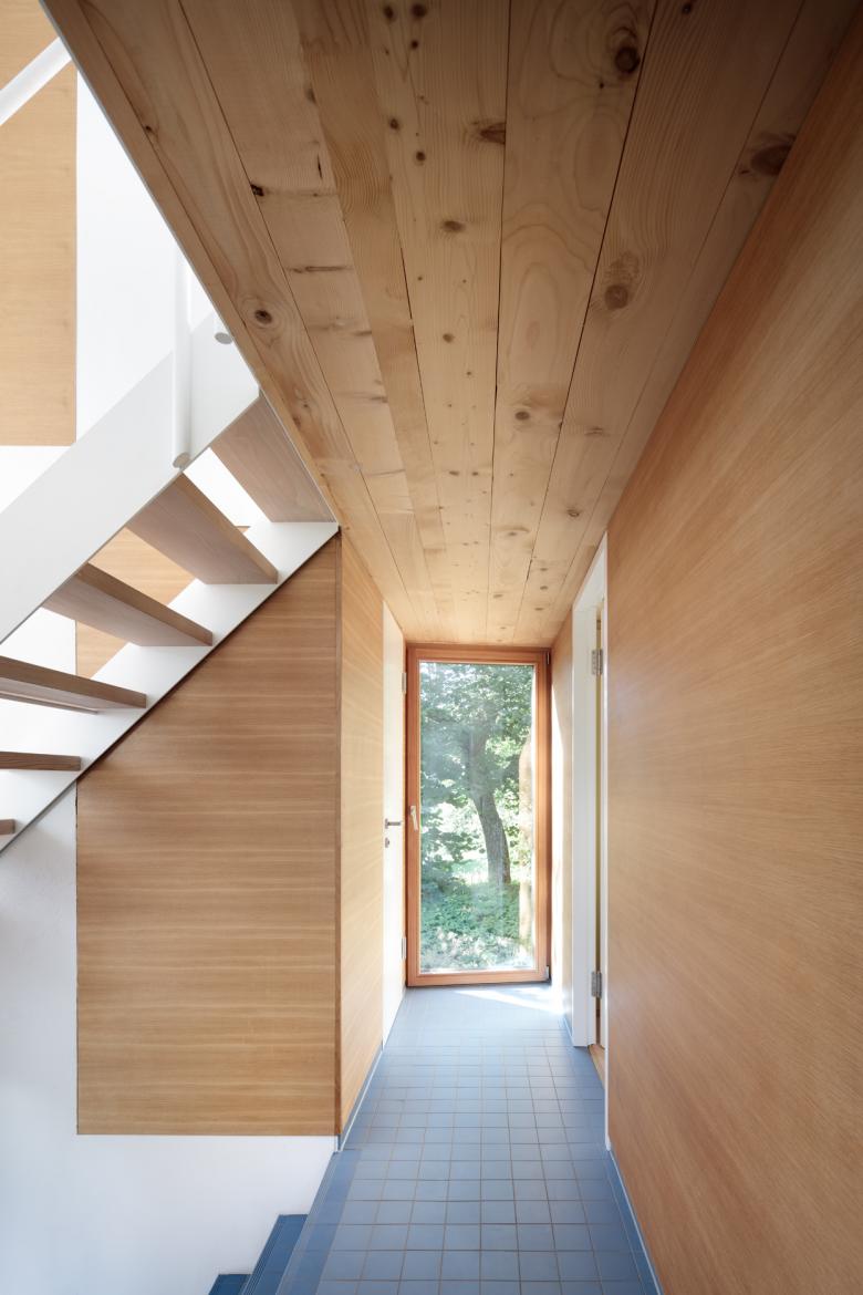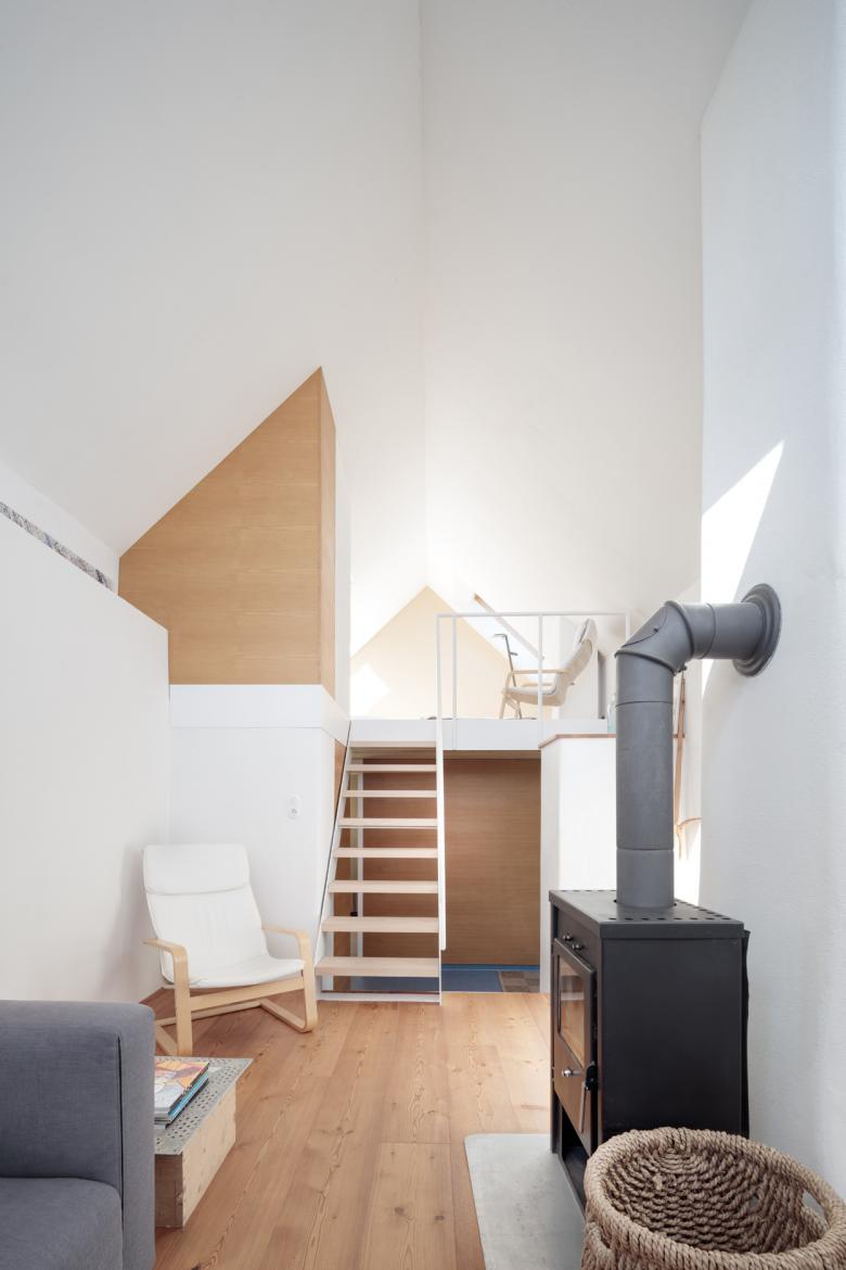Obwohl das Haus nur eine bebaute Fläche von gerade einmal 50m2 aufweist, konnte, durch die Einbeziehung des Dachraumes in das Raumvolumen des Wohnraumes eine großzügige Wohnatmosphäre geschaffen werden. Dies wurde durch die Schaffung einer offenen Schlafebene und einer Galerie noch verstärkt.