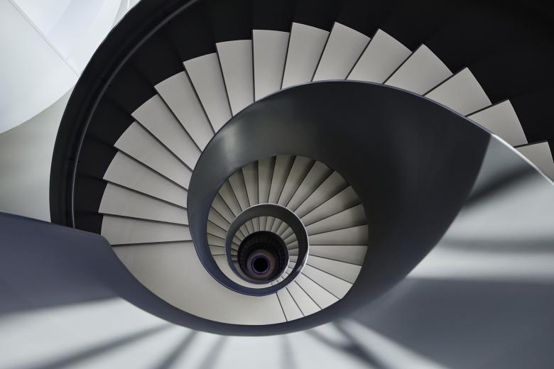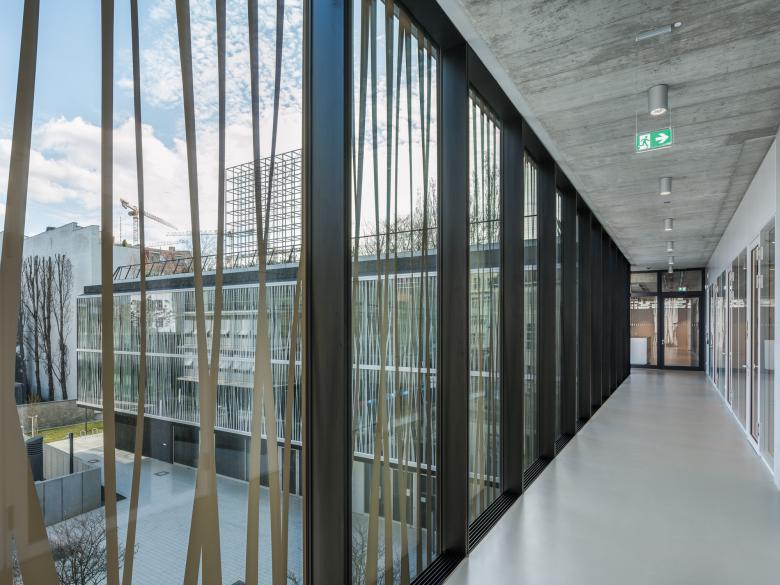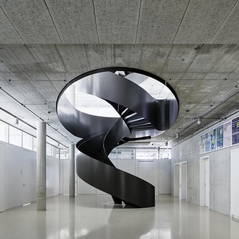 Die Grundrissstruktur des Institutsgebäudes trägt der interdisziplinären Arbeitsweise und der gewünschten Kommunikation zwischen den wissenschaftlichen Arbeitsgruppen Rechnung. Ein alle Geschosse verbindender Luftraum mit skulpturaler Wendeltreppe stellt das prägnante Zentrum des Gebäudes dar, das der Erschließung und der Orientierung dient und als interner Treffpunkt zur Kommunikation einlädt. Hier liegen die Besprechungs- und Aufenthaltsräume sowie die Teeküchen. Da die Wissenschaftler programm- und disziplinübergreifend forschen und sowohl experimentelle als auch mathematische An- sätze verfolgen, kommen im Institut klassische experimentelle molekularbiologische Laborarbeitsplätze mit rechnerintensiven bioinformatischen und theoretischen Arbeitsplätze zusammen, wobei die Anteile der jeweiligen Arbeitsplätze je Arbeitsgruppe variieren und flexibel anpassbar sind.
