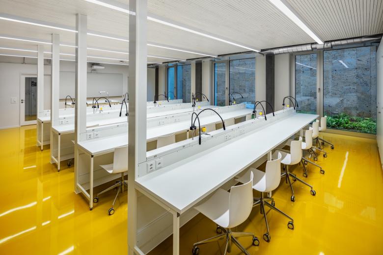 Auf die urbane Dichte des Gebäudeensembles antwortet im Inneren des Bildungszentrums ein grosszügiges Atrium. Das Foyer mit seinen Lerninseln ist Lichthof und Herz des Hauses. Beim Durchschreiten zeigt sich hier das einfach organisierte Innenleben des Gebäudes: Direkt anschliessend finden sich Cafeteria, Mediothek und Rezeption.