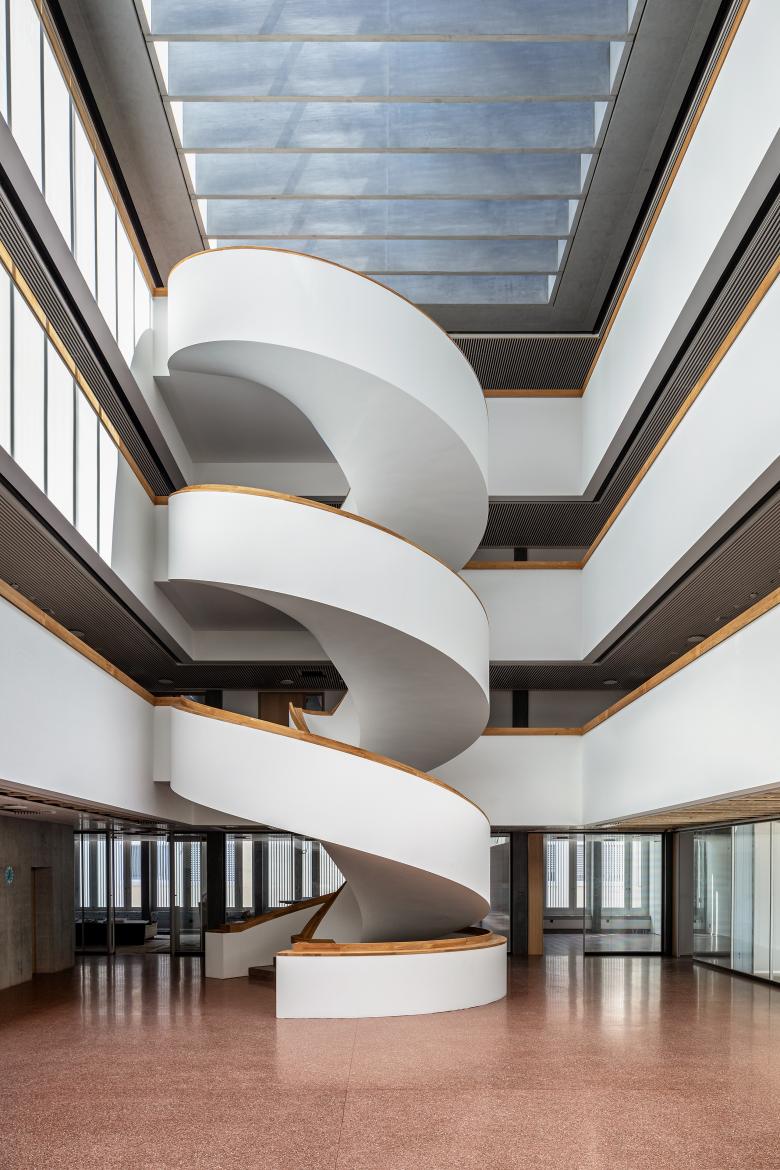 Zu den Unterrichtsräumen in den Galeriegeschossen gelangt man über die freistehende Spiraltreppe. Sie steht als dynamisches Element der Drehung in Kontrast zur ruhigen, sachlichen Hülle und erlaubt, aus den Galerien herauszutreten – hinein in den Luftraum des Lichthofs. Wechselnde Perspektiven auf die vielfältigen Lernwelten des Bildungszentrums Gesundheit Zentralschweiz unterstützen die Lust auf Teilnahme und Engagement – sowohl bei Lehrenden wie bei Lernenden.