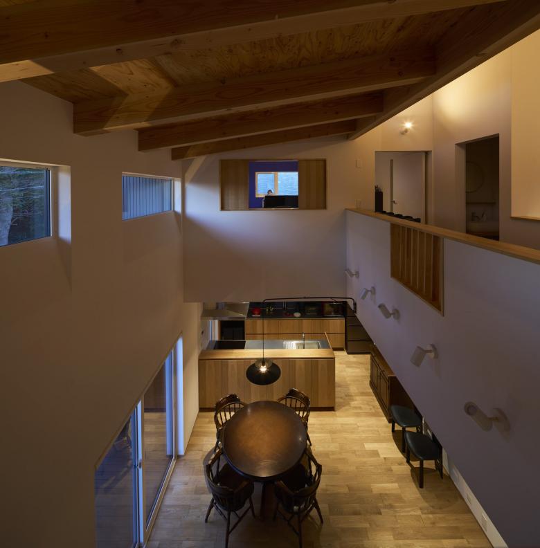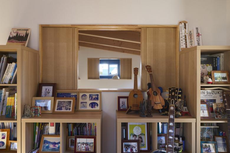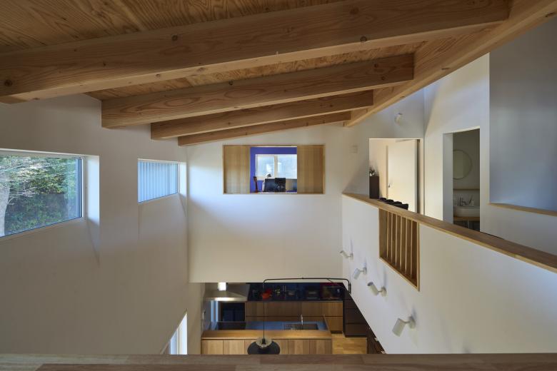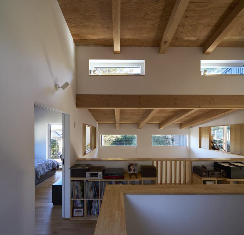 吹抜けに面した2階の動線からは、1階の暮らしを見下ろすことが出来る。この場所にはオーディオラックが造り付けられており、その一部にベンチが設けられていることで、単なる廊下ではない、居間・寝室に続く「第三の居場所」が生み出されている。