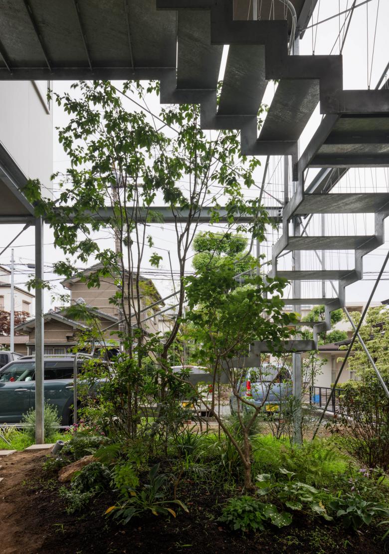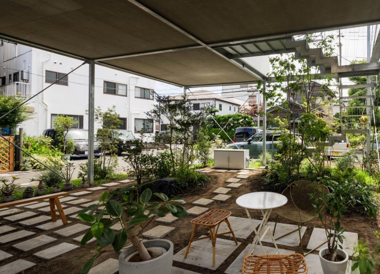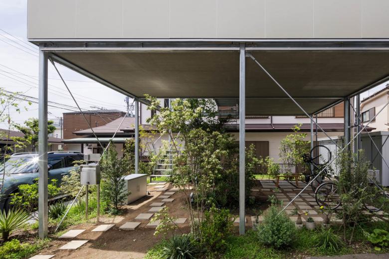 建物ヴォリュームを浸水想定レベルより上の地上約4mまで持ち上げ、オープンになった1階を敷地いっぱいに広がる大きな庭とした。そこに大小さまざまな植物を植え、ずらして設けた2、3階のふたつの吹き抜けを介して、地上から断面的につなぐ。緑茂る庭でありながら軒下の縁側のようでもあり、同時に街なかの原っぱをイメージする公共性を帯びた曖昧な空間を目指した。