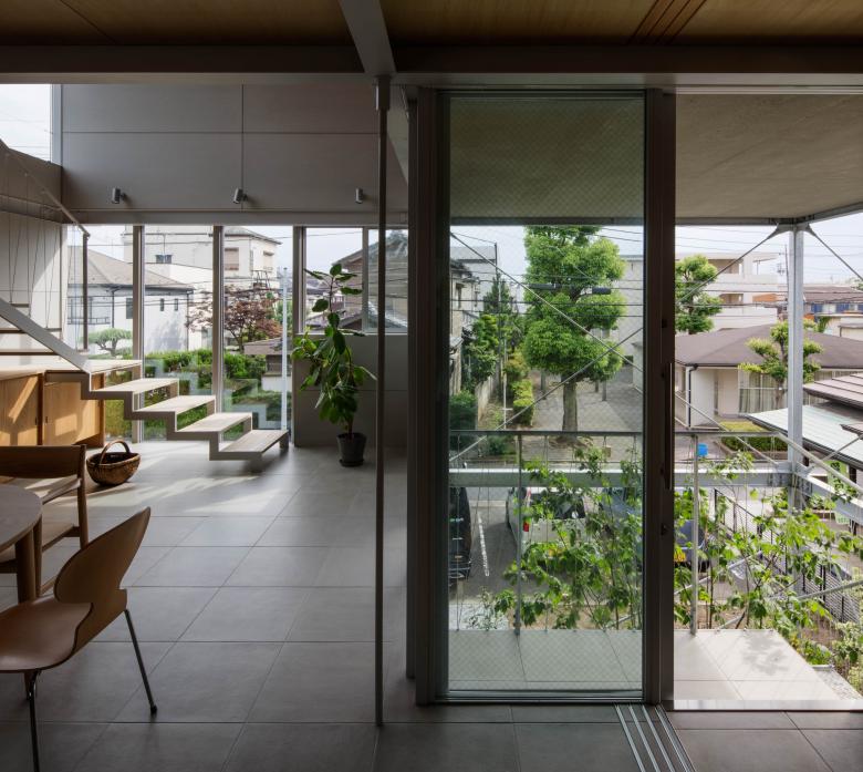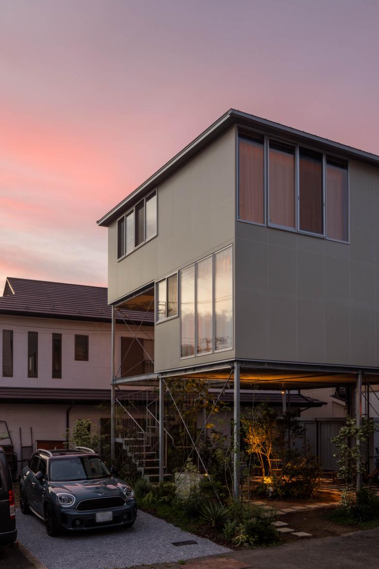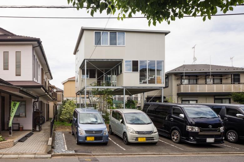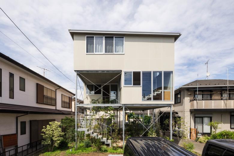 都内に建つ夫婦と子どもひとりのための住宅である。敷地は近くに流れる川からの浸水の恐れがある場所であり、その水害への備えに加えて、将来のライフスタイルの変化に対応でき、また日常的な在宅ワークや家具などの配置替えが容易なフレキシビリティのあるプラン、そして緑を望める明るい住まいを求められた。