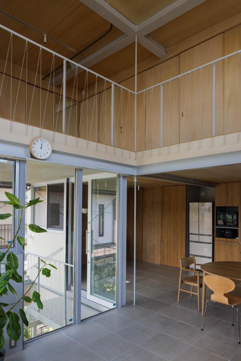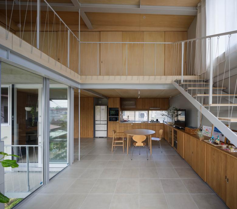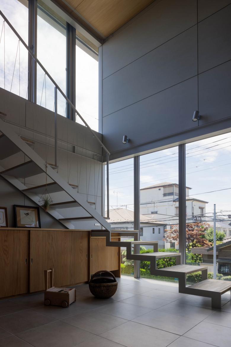 上階には大きな窓をさまざまに開けた。それらをゆったりとした階段で結び、異なるレベルから階下に広がる緑や、上の窓を通して空を感じられる。季節や気候に応じてそれぞれが思い思いに居場所を選べる、シンプルでおおらかな住宅を目指した。