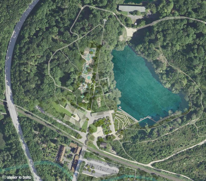 Durch einfache Eingriffe und eine Neuordnung des Areals werden die Besonderheiten der Kulturlandschaft um den Blauen See wieder erlebbar gemacht. Die beiden Gebäude des Umweltbildungszentrums und des Cafés bilden städtebauliche Kanten, die die neu geschaffenen Freiräume fassen und den Übergang zum Themen- und Erlebnisspielplatz definieren. Die heutige Eingangssituation mit ihren zwei mächtigen Platanen wird aufgewertet und räumlich an den historischen Kalkofenplatz angebunden. Eine neue Rampe ermöglicht nun den barrierefreien Zugang zum See und zu den wassernahen Aktivitäten und bietet unterschiedliche Perspektiven auf den Kalkofen, den See und die Pflanzen im Felsengarten.