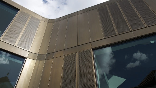 Facaden på den nye foyer passer sig ind i området med en afrundet form, der skaber et defineret gårdrum mod teateret. Facaden beklædes med tombak – en legering bestående af zink og kobber, der over tid patinerer til en mørk gylden nuance. Guldsalens facade er med ombygningen blevet frilagt og får sit eget udtryk med fløjdøre i glas, der åbner op mod den nye Rådhusplads. Pladsen er tegnet af landskabsarkitekterne PK3.