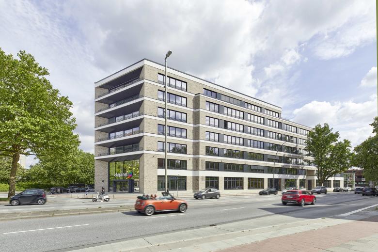 Der dreieckige Baukörper ist mit drei Erschließungskernen jeweils in den Ecken sehr klar strukturiert, die obergeschossige BGF von ca. 21.000 m2 ist für großflächige Vermietung optimiert, und ebenso in kleine Einheiten teilbar. Die Höhenstaffelung des Baukörpers ermöglicht vielseitige Außenflächen als Dachterrassen und Balkone. Der ruhige und begrünte Innenhof dient als Gegenpol zur städtischen Umgebung. Im Erdgeschoss ist eine Gastronomienutzung vorgesehen, die sowohl den Mietern als auch der Öffentlichkeit zur Verfügung steht.