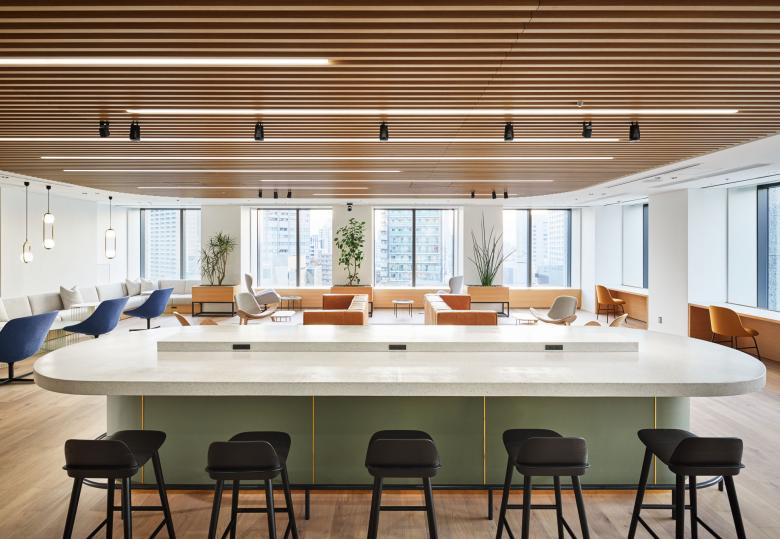 執務スペースから独立して設けたゲストエリアのラウンジは、ソロワークやチームミーティングに加え、タウンホールとしても機能する多用途スペースとしてデザインしました。このラウンジは、来訪者に印象づける企業の“顔”としての役割と同時に、社内の活性化を担う重要なハブとして、新たなワークスタイルの確立に貢献しています。