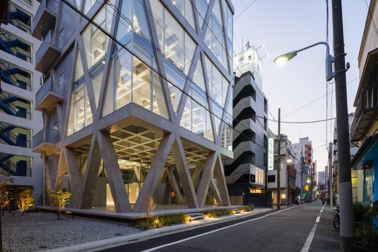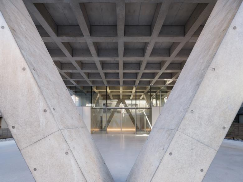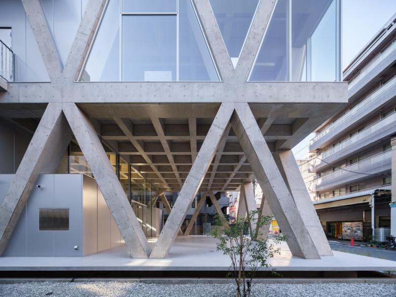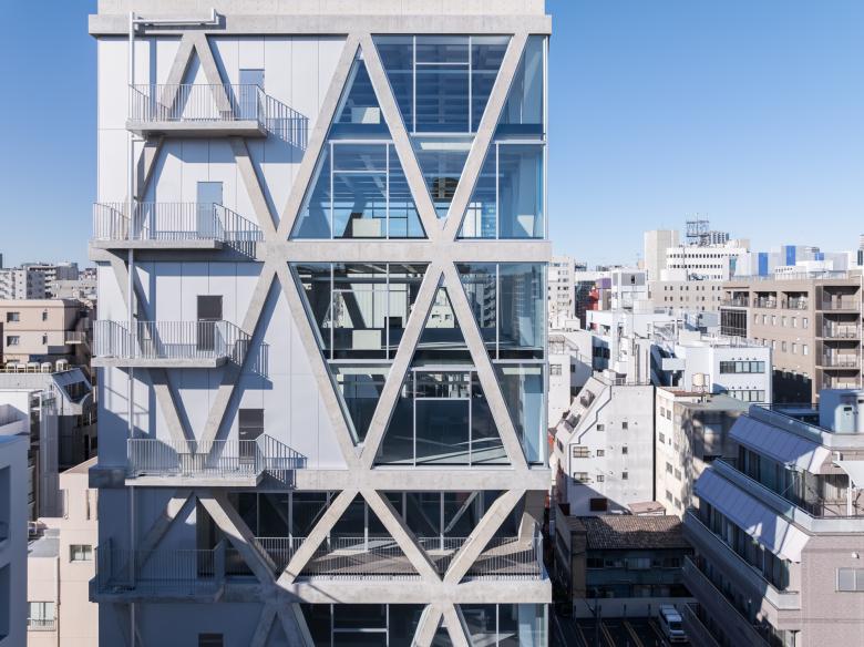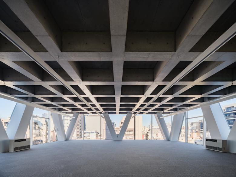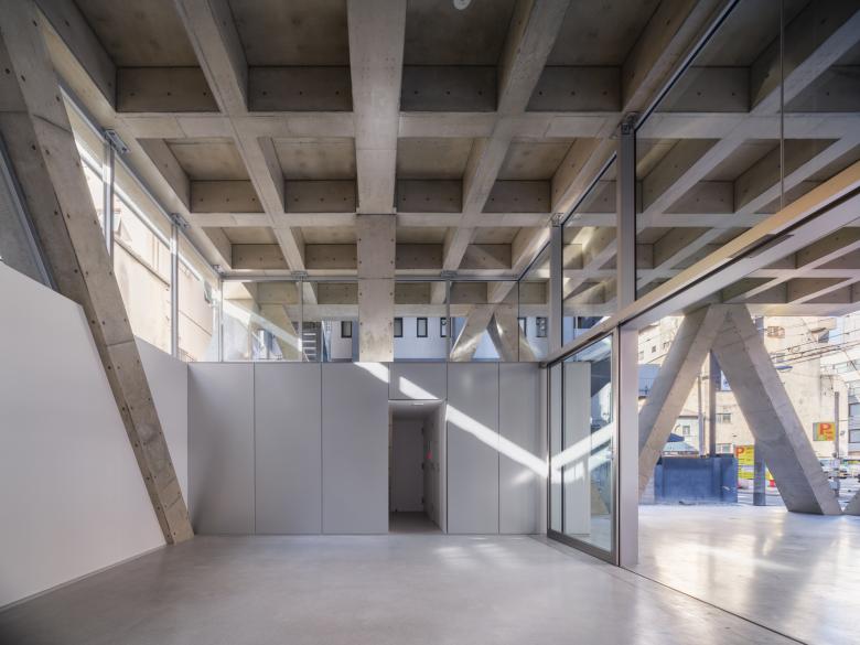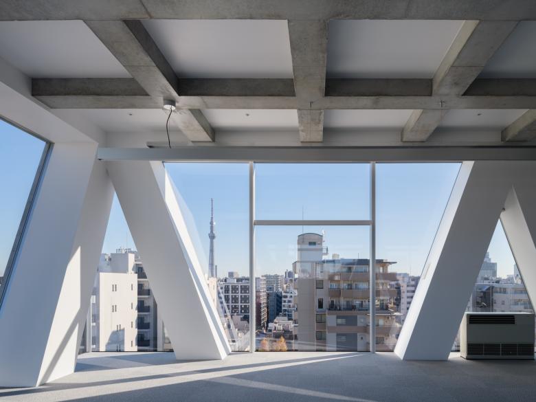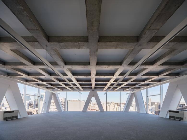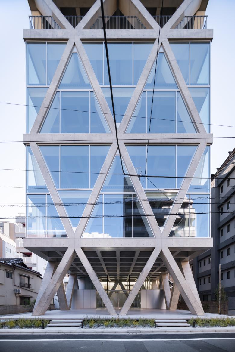 隣地境界からの5mの離隔はいわゆる「延焼ライン」を外しているので、この建物はその制約から自由になっている。そこでRCのフレームを表に現し、2層に貫く斜め柱と梁の架構によって建物全体を構成している。各階の梁成は600mmとしているが、斜め柱が交差しない階ではスパンが短くなるので、梁幅を薄く抑えることができ、その外側にサッシや外壁を通すことで、外観上は2層毎に梁が表れる。柱も2層に貫くようにみえるから、細身のプロポーションと堅実なRCの素材感の対比、また大きな異形のサッシを通した透明感が同居した外観の表現を獲得している。