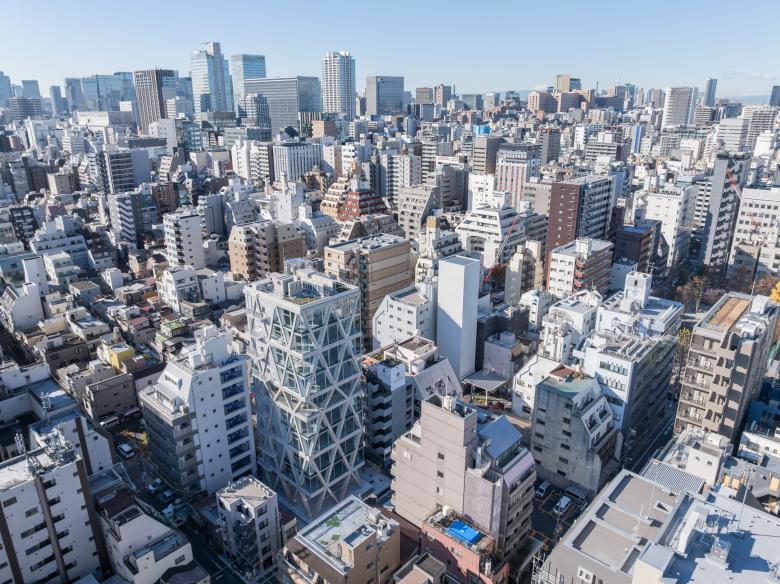 本計画は、以前は倉庫と駐車場であった敷地を合筆して、賃貸のオフィスビルとしたものである。北側からの道路斜線が厳しいなか、天空率を利用し東西の隣地境界から5mセットバックすることによって40mを超える高さのヴォリュームを建てられることが判り、容積率消化が可能となった。基準法上の道路の最低幅員が4mであることを考えると、隣地からの5mの離隔は東西側に道路を敷設したに等しいスケールである。外観上の見え方としては三方向に接道しているかのようで、ヴォリュームの高さも相まってランドマーク的で、雑然とした周辺から独立したような建ち方をしている。