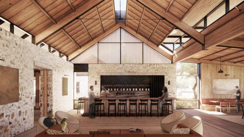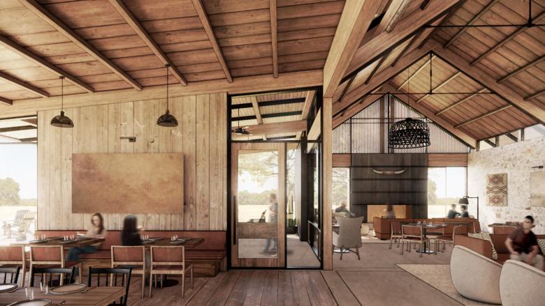 The project creates a communal amenity subtly blurring the line between public and private areas with a well-crafted relationship between conditioned spaces, porches, courtyards, and landscape areas. As one approaches the buildings, both the lodge and restaurant meet in a common entry breezeway, framing the views of the prairie and hills beyond. The breezeway leads into a courtyard where all parts of the program, including a barbecue smoke house and a casual music venue, come together in an expansive outdoor gathering space, offering a relaxed experience to all visitors.