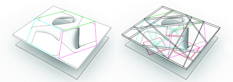 Based on the specificity of the site, the design of the pavilion develops an elaborated relationship to the existing form of a rigid geometry but it also introduces a floating and multi-directional space. It orients itself to the city texture, to the flows of visitors exploring Millennium Park and most importantly introduces diverse vistas towards the park and city surroundings. The pavilion is open towards its sides in between two at the outset horizontal planes of a podium and a roof.