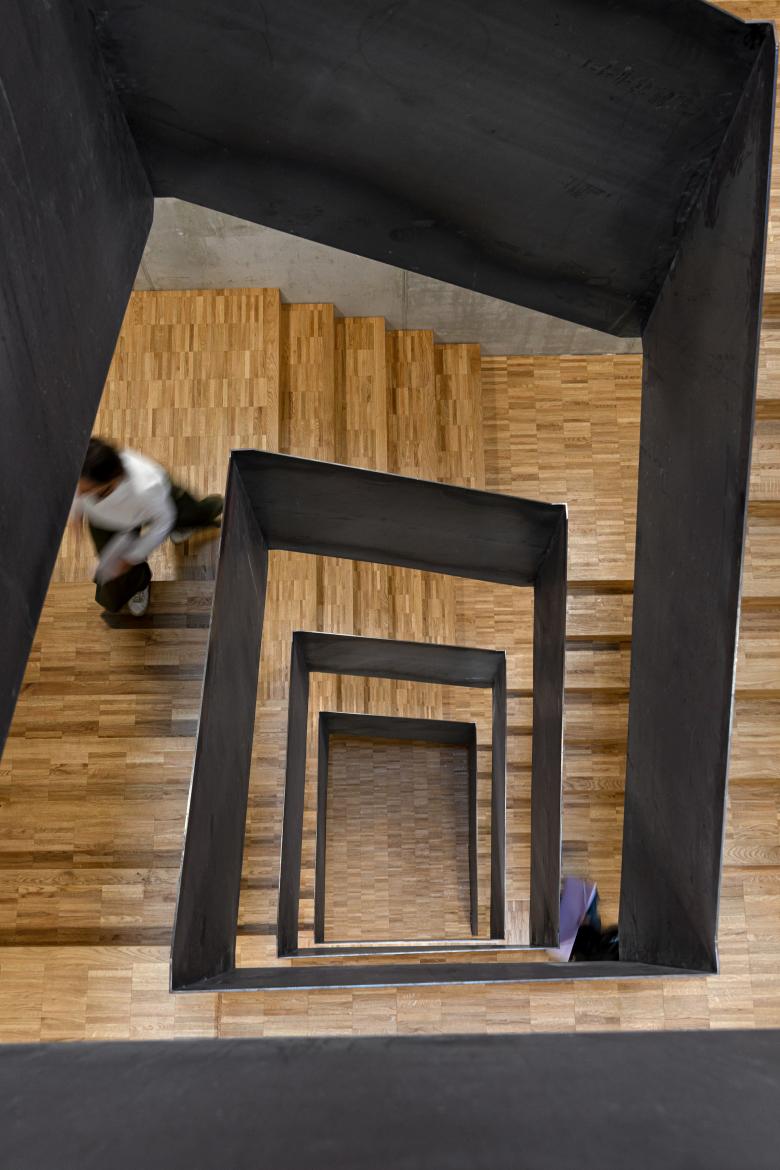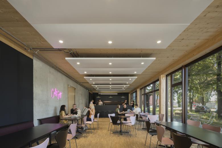 Fassadenbrüstungen in Holzrahmenbauweise mit hinterlüfteten Holzlatten machen die Konstruktion von außen sichtbar. Die beiden Treppenkerne aus Sichtbeton dienen zum Aussteifen des Holzskelettbaus aus Holzstützen und Unterzügen. Ein grundwasserbasiertes CO2- freies Heiz- und Kühlsystem, Dachbegrünung und Photovoltaik helfen, den KfW-40-Standard zu erreichen. Terrassen im Erdgeschoss und eine große Dachterrasse mit Blick auf die Altstadt sorgen für eine angenehme Arbeitsatmosphäre.