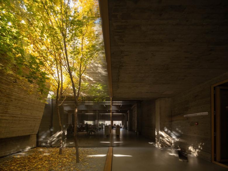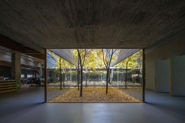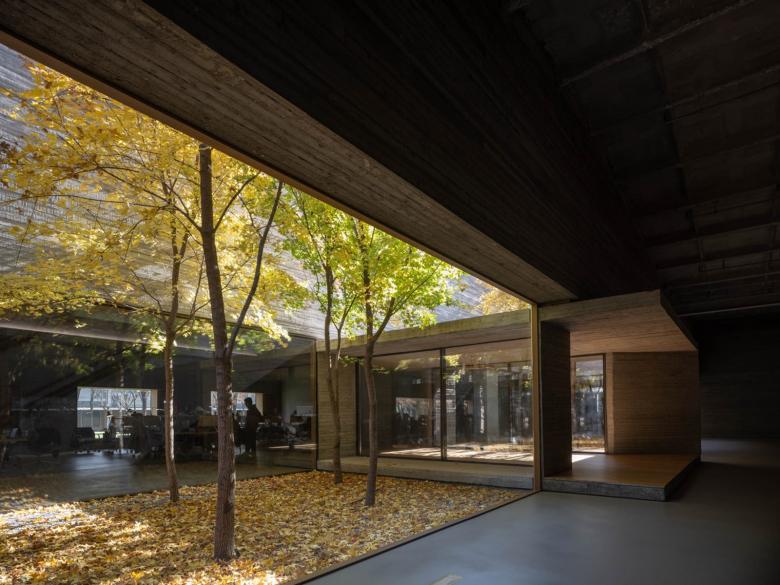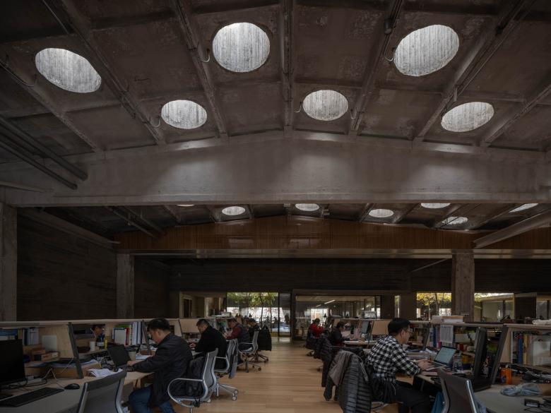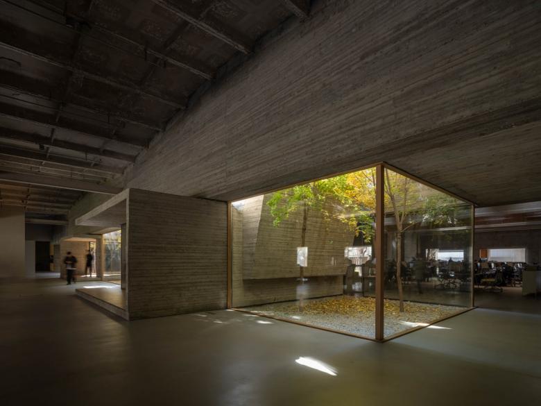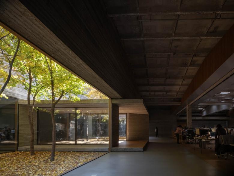 The actual main office area is a big hall divided in two though a stripe-shaped courtyard subtracted from the original building volume. The introvert yet open spatial configuration as well as the atmospheric light brings to mind traditional courtyard typologies in the historic center of Beijing.