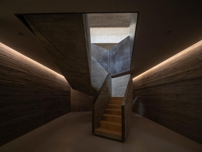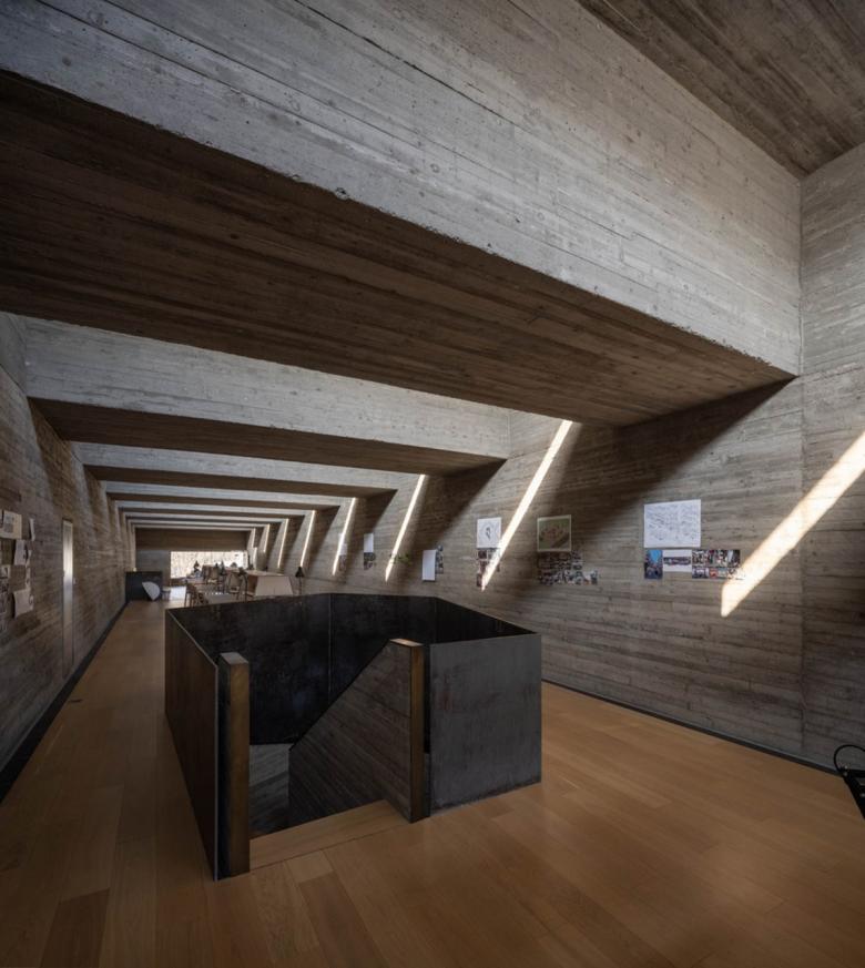Further north, a sculptural triple-run stairs leads to the executive lounge on the second floor. A regular, monumental series of skylights cast in concrete bright up the space. Towards the east, one can access the roof of the library pavilion, from where one overviews the entire campus.