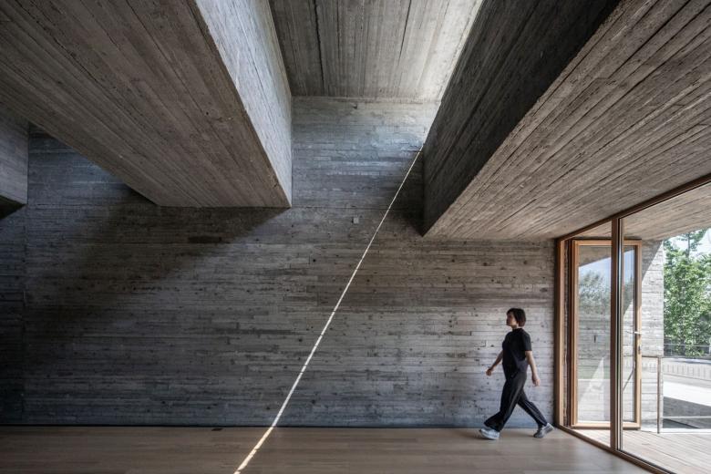 The building is divided into a sequence of four separate areas and a library pavilion attached to it. In contrast to the existing, strictly right-angled architecture, the entrance area forms a spatial surprise. One enters from south into a two-story-high, sculptural space illuminated by a thin slit in the bent roof.