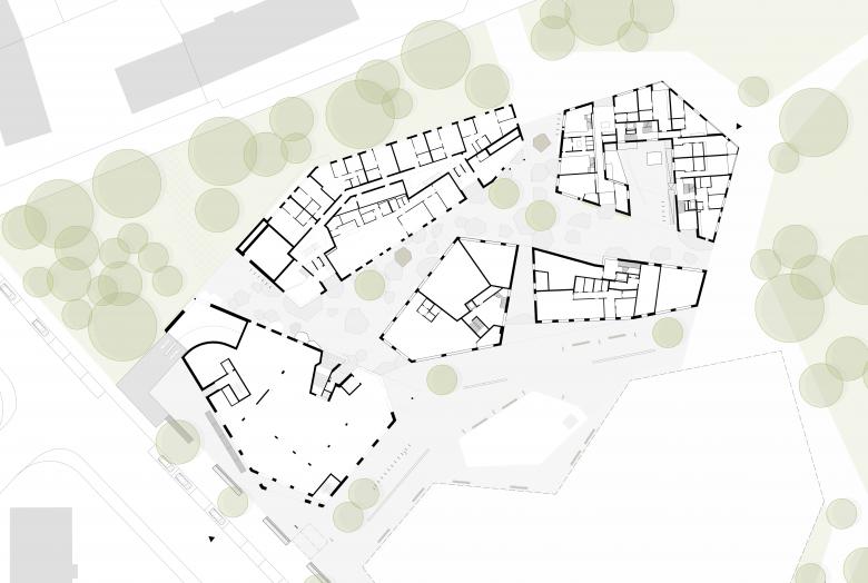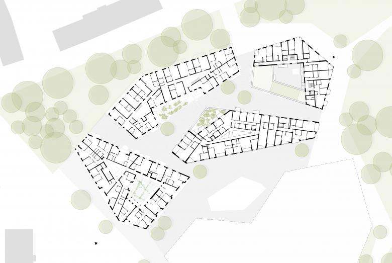 Die Vielfalt der sich wandelnden Gesellschaft, die Vielfalt der Lebensentwürfe bilden sich in der Grundstruktur und den Wohnungstypen ab. Eigentlich ist jeder Bauteil und jede Wohnung einzigartig, jedoch ohne verspielt und abgehoben zu werden. Jede Wohnung hat einen anderen Blick, anderes Licht, andere Außenräume. Diese Vielfalt brauchen wir schon jetzt und werden wir in Zukunft noch viel mehr benötigen. Gemeinschaftsräume und private Innenhöfe sind die weitere Basis für neue und andere Formen des Zusammenlebens, des Wohnens und des Wohnens und Arbeitens. Auch im Alter.