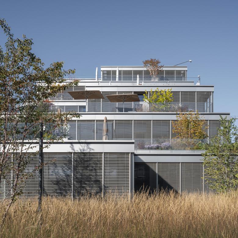 L’enveloppe est constituée de façades rideaux bordées par des coursives protégées par des stores de protection solaire. Ce système, simple et éprouvé, permet d’ouvrir généreusement la vue des espaces de travail sur les espaces végétalisés entre les bâtiments, ainsi que sur le paysage plus lointain.