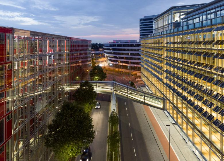 Die polymorphe Capricornbrücke im Düsseldorfer Medienhafen verbindet zwei Gebäude der Firmenzentrale Uniper: das `Capricornhaus‘ von GATERMANN+SCHOSSIG und das ‚FLOAT‘ von Renzo Piano Architekten.