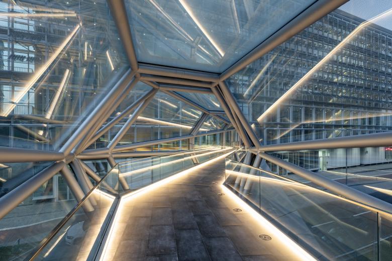Die Stahl- und Glaskonstruktion setzt sich formal als eigenständiges Element von den zwei sehr unterschiedlichen Gebäuden ab. Die komplexe Form der Brücke wird aus den differierenden Gebäudeachsen und Eintrittsmöglichkeiten in die Bauten hergeleitet. Die Tragstruktur der 37 m langen, geknickten Brücke besteht aus Stahlrohren, auf denen die trapez- und dreiecksförmigen, zum Teil sehr spitz zulaufenden Glaselemente direkt aufliegen. In diesem allseitig umschlossenen facettierten „Tube“ führt ein Metallsteg in 4m Höhe über die Holzstraße. Die minimalistische, an die Architektur angepasste Beleuchtung zeichnet die Form des Weges nach und lässt ihn in den Abendstunden fast schwebend erscheinen. Von außen betrachtet erscheint die Brücke durch die polygonale Ausführung wie ein geschliffener „Diamant“, der sobald es draußen dunkel wird, von Innen nach Außen als ein Körper leuchtet.