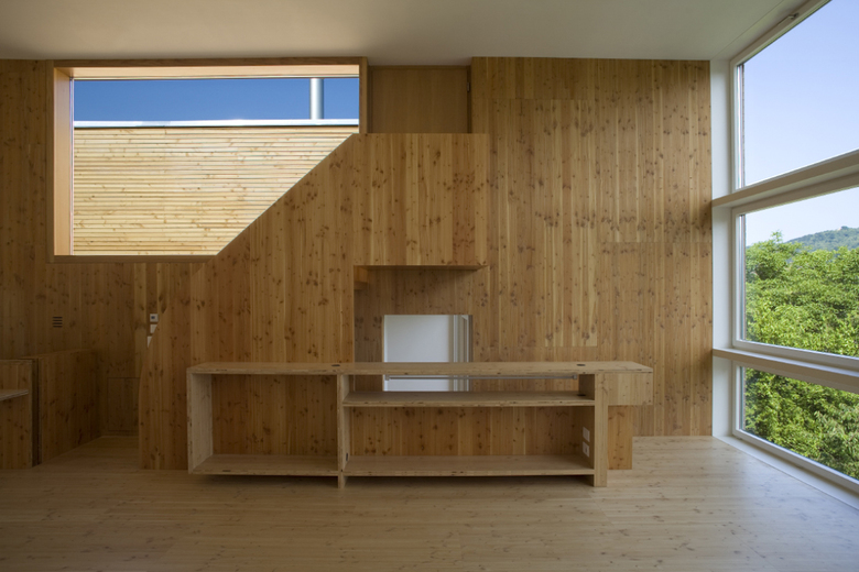 L’edificio è costituito da una costruzione prefabbricata in legno intelaiato, appoggiata su uno zoccolo in cemento armato che contiene l’autorimessa. Il rivestimento è di listelli orizzontali in douglasie grezze.