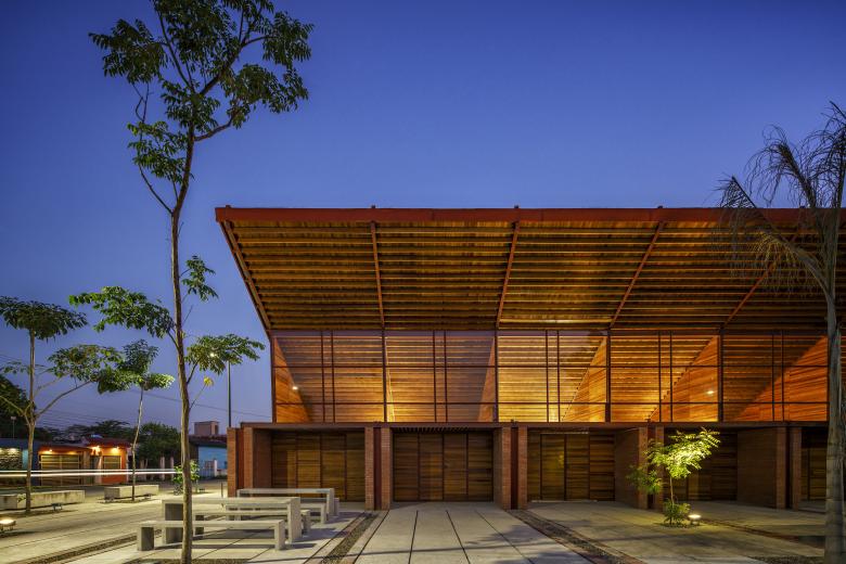 It is essential that projects pay tribute to their location, particularly when they have the potential to highlight what already exists. Rainwater is captured, collected, and filtered for use in restrooms before passing through a system of biodigesters and biofilters via wetlands before returning to the river. The coconut wood used on the site is highly sustainable, as it is an abundant and renewable resource that captures a significant amount of CO2 during its life cycle. Its production and transportation also generate a smaller carbon footprint than other materials. The use of local resources promotes handicraft production and provides employment opportunities for the local workforce.