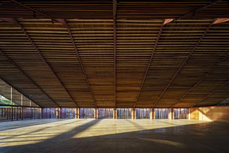 The Music School consists of eight classrooms, a cafeteria, restrooms, and management offices. The sloping roof of the building creates a double-height space in each of these areas, with an upper terrace offering views of the treetops. The complex discharges clean water into the rivers using a system that includes a series of treatment wetlands. The intention is to demonstrate how an alternative approach to the river is possible.