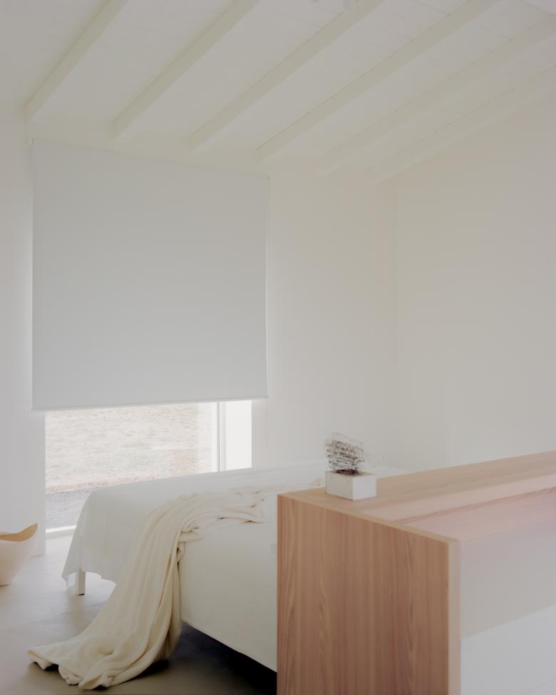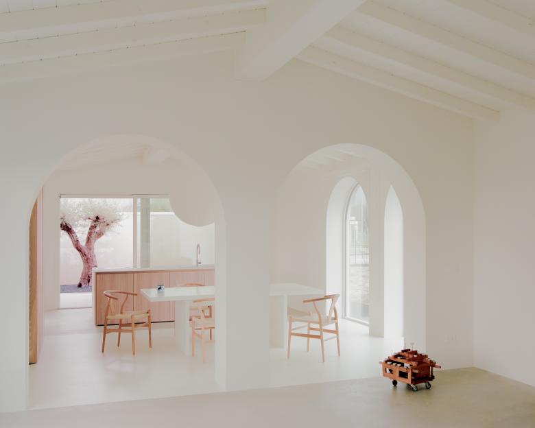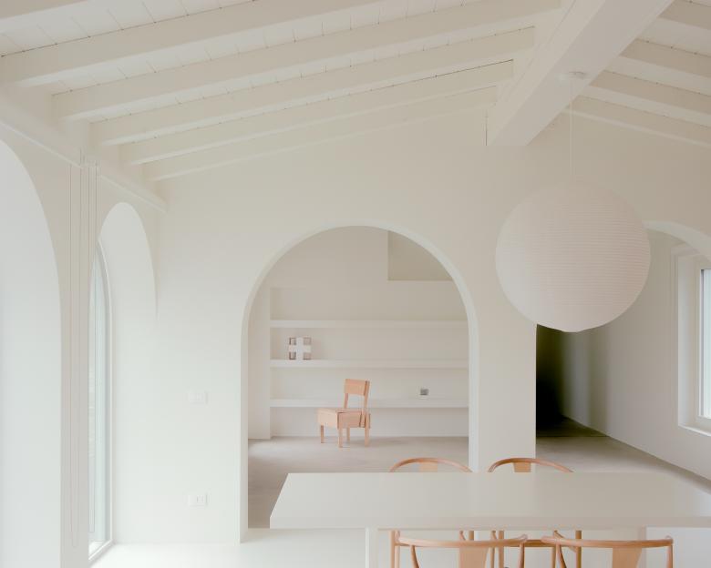 Alla superficie aspra e materica del fabbricato, si contrappone uno spazio interno accogliente e semplice.