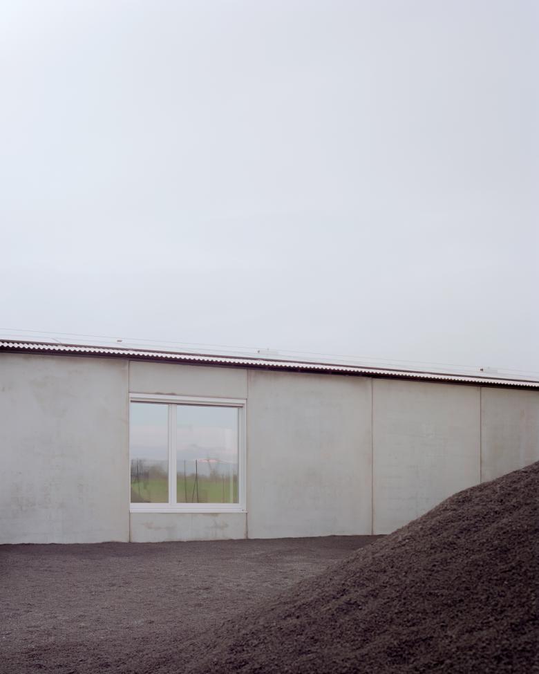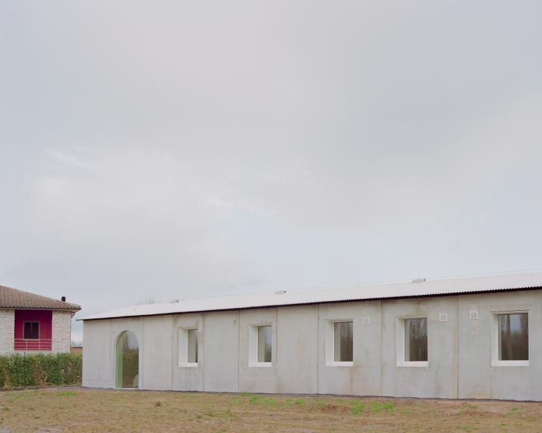 L’ edificio in cemento prefabbricato con copertura in lamiera bianca rinnova la tradizione del paesaggio agrario padano storicamente costituito dalla presenza di volumi elementari caratterizzati da semplici geometrie euclidee.
