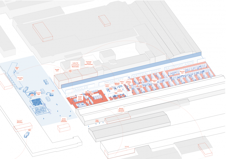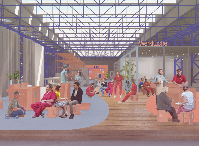 In vielen Städten gibt es auf ehemaligen Industriestandorten große Leerflächen, denen trotz hohem räumlichen Potenzial oft ein gutes Konzept für die zukünftige Nutzung fehlt. Anstatt das Grundstück an private Bauträger*innen zu verkaufen, könnte ein öffentliches, modernisiertes Industriegelände umgesetzt werden, um neue kreative Potenziale zu schaffen und die lokale städtische Produktion zu stärken. Wir haben für solch eine Situation eine Case-Study durchgeführt und den Common Space Circular Hub entwickelt.