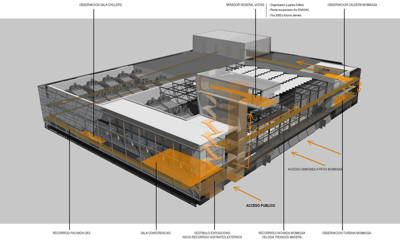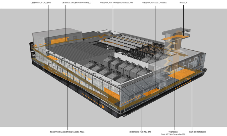 És una central pionera en el sud d' Europa pel que fa a producció i ús sostenible de l'energia, que compta amb diferents tecnologies d' alta eficiència. Proporciona una xarxa urbana de distribució de fred/calor i permet injectar electricitat auto generada a la xarxa de distribució, amb l' aprofitament del fred residual de la planta de regasificació del port de Barcelona i de la biomasa procedent de la poda urbana i metropolitana. La proposta arquitectònica afegeix al programa funcional (industrial i d' oficines), espais destinats a mostrar al públic els processos de producció a través d'un recorregut perimetral de visita a les instal.lacions que acaba configurant les façanes, aportant un caràcter educatiu, formatiu i de divulgació dels valors mediambientals i de sostenibilitat que han d'orientar l'activitat humana. Cadascuna de les façanes està associada a un dels sistemes presents a la central: aigua, biomassa i gas.