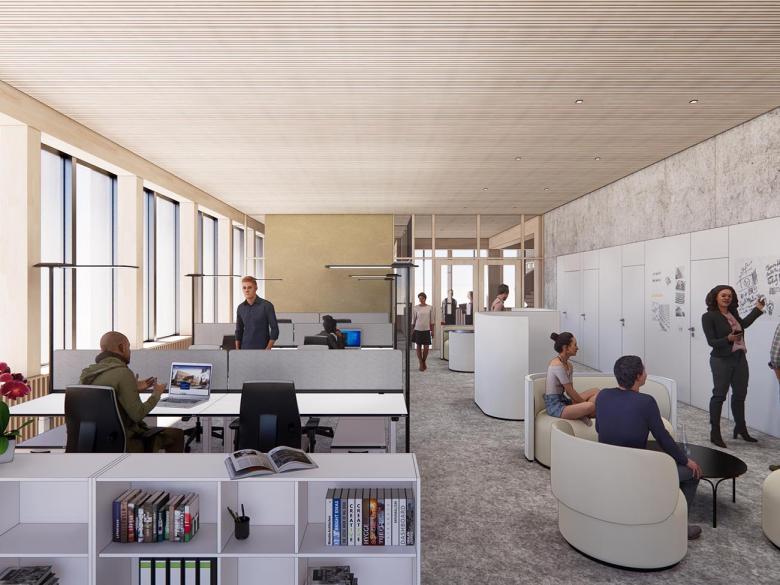Mit geringem Aufwand können die Labor- und Bürobereiche von Groß- zu Einzelraumstrukturen umfunktioniert werden. Der multifunktionale “Boulevard der Begegnungen” dient als horizontale und vertikale Verbindungsachse mit verschiedenen Aufenthaltsflächen für Mitarbeiter:innen und Besucher:innen.