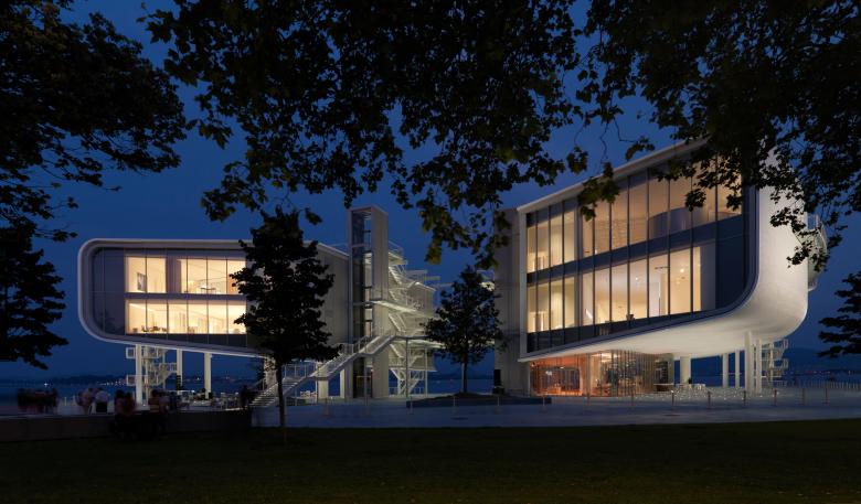 The lighting design creates a relationship at night that links the new building, the sea and the city, without being overly obvious and giving the area a new character. The light explores the feeling of lightness, reinforcing the architectural concept. Interacting with the pearl coloured tiles and the translucent glass, the light transforms the building into a “ship” anchored in a sea of reflections.