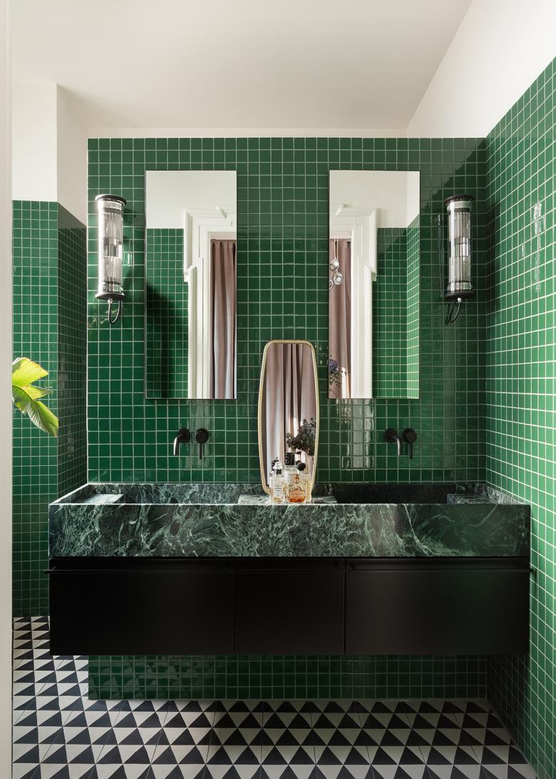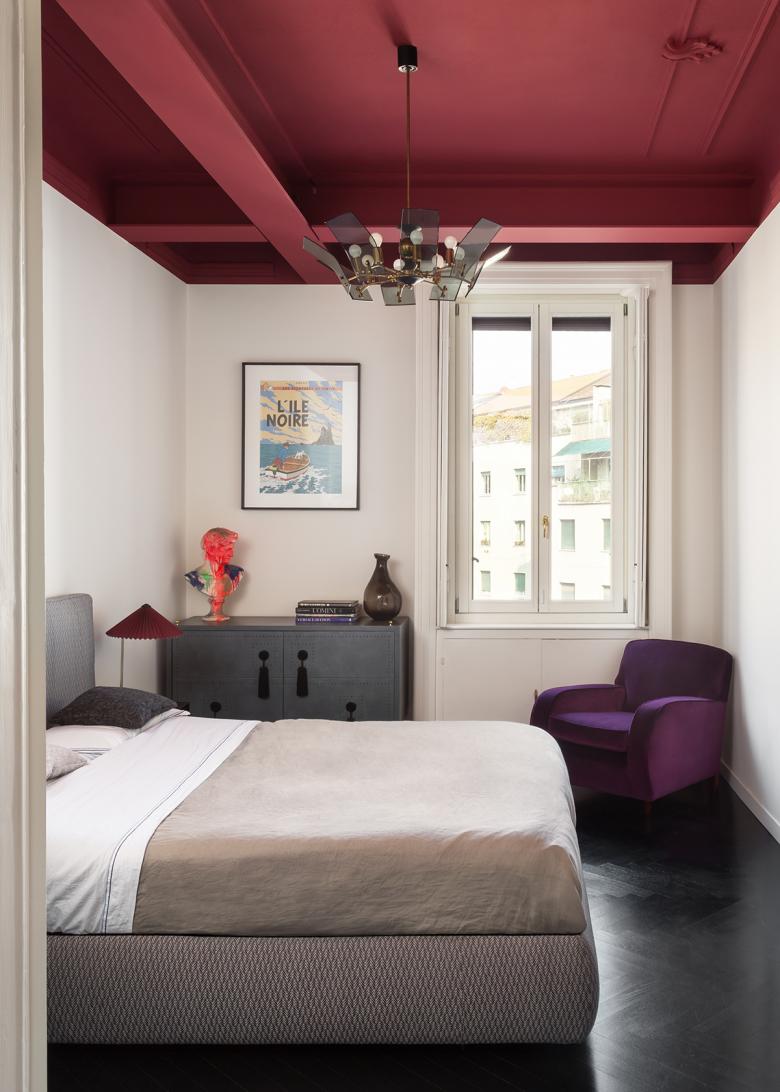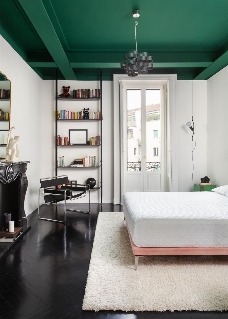 To mark the change and create more emphasis from one floor to the next, a polished brass inlaid plate was installed on each passageway door. The powder room and master bathroom have a a new black and white design on the floor that contrasts with the colourful tiles on the walls. The bedrooms have coloured ceilings to integrate the structural reinforcement beams and create a more intimate atmosphere for the sleeping area. Contrasts were used when selecting the materials for the interior design project. Noble materials such as marble (Arabescato Corchia and Verde Alpi) and softer fabrics such as silk, velvet and bouclé wool for the curtains and seating were combined with metals such as raw iron for the cabinet and sliding doors of the kitchen to reflect the eclectic soul of the owners. The same spirit guided the selection of furniture, a balanced mix of 20th-century designer pieces and modern antiques.