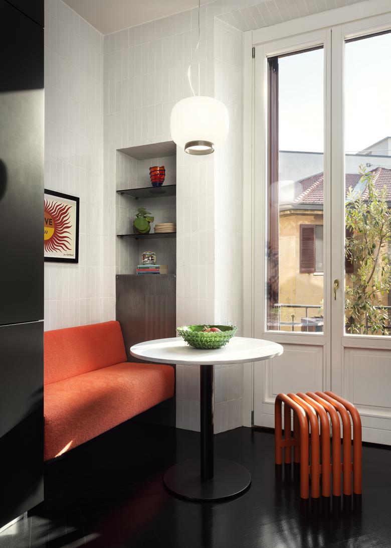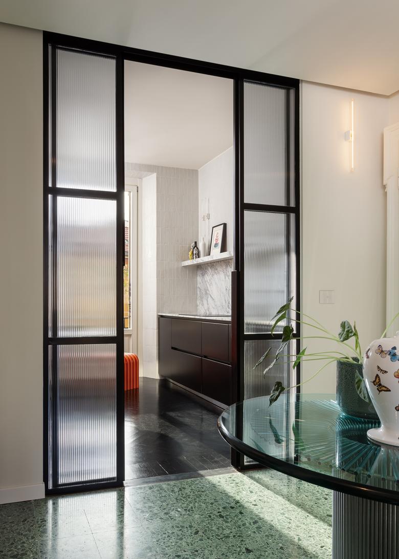 The entrance was made more functional by opening up the kitchen and creating a free passage to the living area, where all the original internal walls were demolished to create a more dynamic and flexible layout with three distinct zones, each dedicated to a different function: a dining area, a living room for conversation and a space for more relaxed and cosy moments. The original materials were preserved, such as the stucco decorations on the ceiling and the frames of the double doors. The existing green terrazzo tiles in the hallways were simply polished, while the wood floors in the bedrooms and living areas were refinished to give them a sexy, metropolitan charm; in fact, the choice of a semi-gloss black varnish reveals the original laying pattern and reproduces the light reflections in the room.