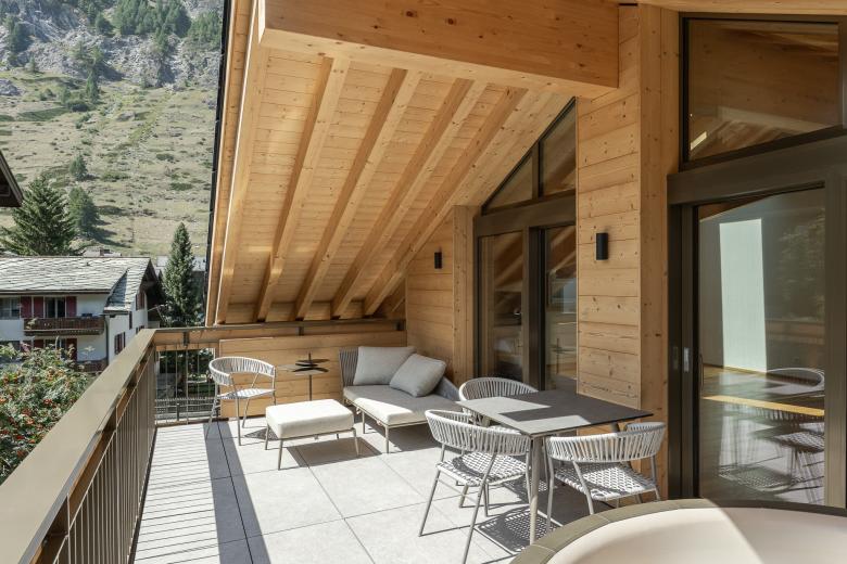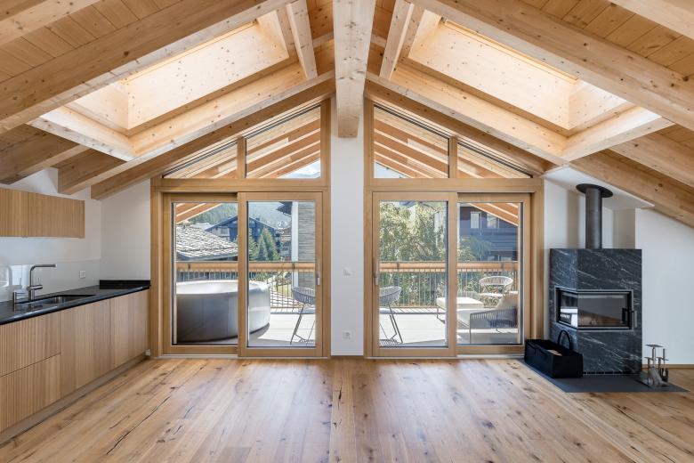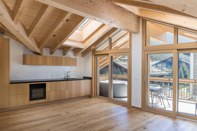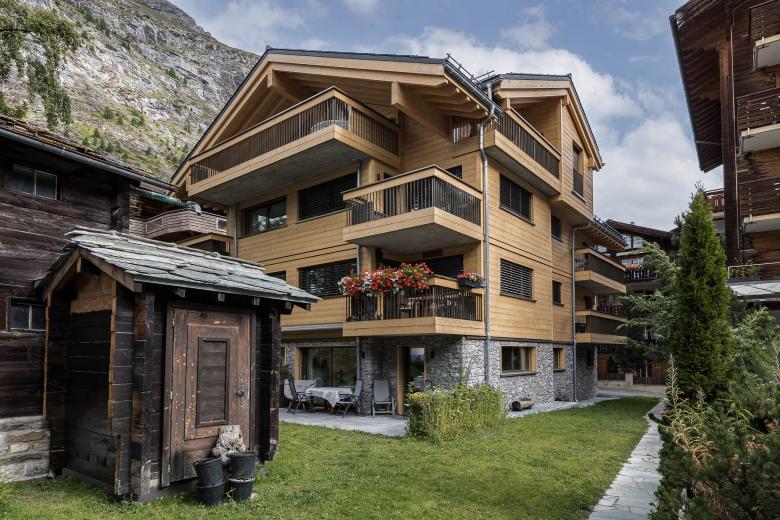 Die elf Wohnungen auf vier Geschossen sind so angelegt, dass sie alle nach Süden ausgerichtet sind und teilweise Matterhornsicht bieten. Das aussenliegende Treppenhaus mit einem filigranen Stakettengeländer bietet einen freien Blick nach draussen. Im Untergeschoss befindet sich ein moderner, gemeinschaftlich nutzbarer Skiraum mit einzeln abschliessbaren Skischränken.
