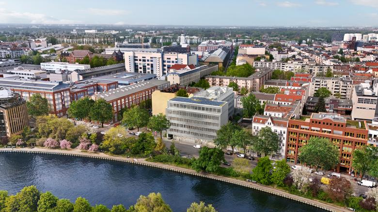 Die südliche Fassade mit vertikal vorgehängten Aluminium-Lamellen ist vom nahegelegenen Spreeufer inspiriert und spiegelt Wasserreflexionen und -geometrie wider. Innen dominieren offene Bürostrukturen und hochmoderne Laborflächen, die räumliche und technische Flexibilität mit energetischer Effizienz vereinen.