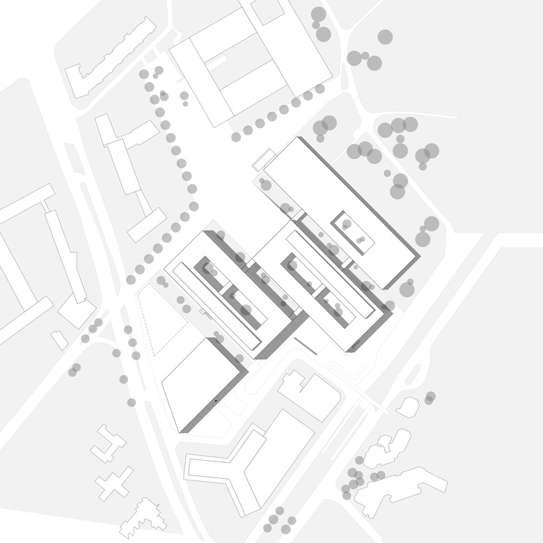 Neue Adresse zum Campus – Der Neubau als Weiterentwicklung des bestehenden Hörsaalgebäudes. Das Hörsaalgebäude ist Footprint für die Neubauten. Er bestimmt Lage und Ausrichtung der Erweiterung. Durch Versetzen der Baukörper zueinander wird ein großzügiger Eingangshof ausgebildet. Das Ensemble wird zu einer erkennbaren Einheit und bildet die neue Adresse zum Campus.