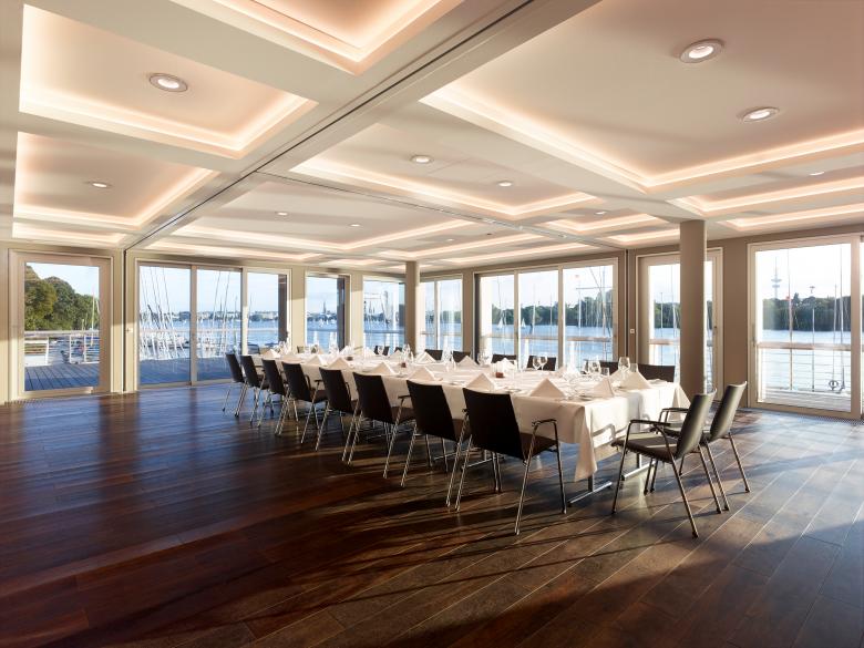 Unter Beibehaltung der historisch gewachsenen Kubatur wurde ein Neubau geschaffen, welcher zwischen Moderne und Tradition tariert, als Vermittler zwischen Nachwuchs und alteingesessenen Hanseaten fungiert. Der deutlich vergrößerte Jugendbereich der „Alsterpiraten“, welcher im großflächigen Untergeschoss liegt ist nur ein Beispiel für das gelungene Zusammenspiel der Generationen in dem neuen Clubhaus. Das neu entwickelte, hinterleuchtete Deckenraster ermöglicht Etablierten und Eingeweihten die Struktur und Baugeschichte der historischen Villa nach zu vollziehen und schafft ein harmonisches Ambiente zum Wohlfühlen. Der große, gehobene Gastronomiebereich mit der „roter Bar“ und dem lauschigen Kaminzimmer bilden das Kommunikative Zentrum des Vereines und bestechen mit einem großartigen Blick auf die Alster und das Stadtpanorama. Im ersten Obergeschoss befindet sich ein, dank mobiler Wandelemente flexibel nutzbarer, Festsaal mit großer Außenterrasse, welcher sich auch bei vereinsexternen großer Beliebtheit erfreut. Die lichtdurchfluteten Büros der Verwaltung im Obergeschoss, ergänzen das Raumprogramm. Im Dachgeschoss wurde ein Sitzungsraum für den Vorstand geschaffen, welcher dank zwei großflächigen Gauben einen unvergleichbaren Ausblick auf Hamburg und die Alster bietet. Die Küche der Gastronomie liegt neben Serviceräumen, den umfassenden Archiven, dem Jugendraum und der Bootswerkstatt im Untergeschoss.