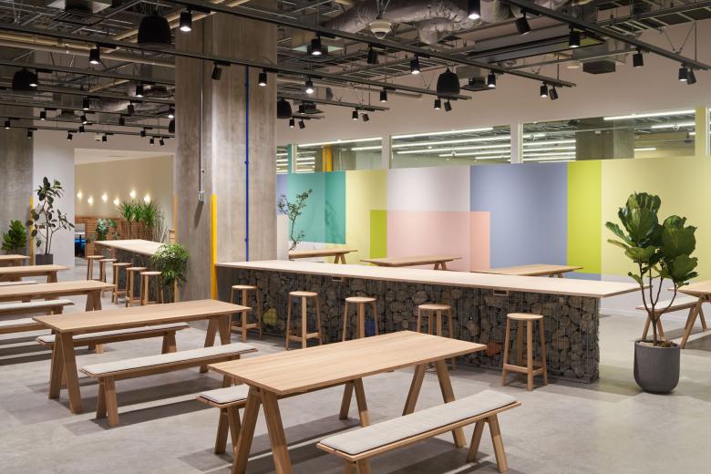 また、この空間を印象づける要素の一つである色については、ブランドカラーの赤を来客エリアなどの要所に用いるとともに、社員用のスペースには赤以外のブランドカラーを用いることで視覚的な楽しさを散りばめています。