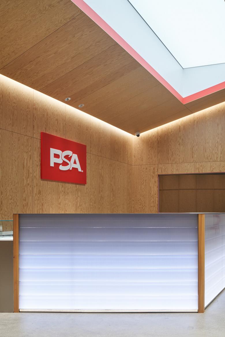 物流倉庫という特殊な建物の魅力を生かすため、素地の部材や躯体そのものを見せるデザインによりコストを抑えつつ、その周囲に新たなマテリアルや色彩などの要素を重ね合わせ、無骨な空間の中に華やかさと楽しさ、ダイナミックさを表現することを目指しました。受付カウンターは、不要となったカード用の保護ケースをおよそ6000枚支給してもらい、光と組み合わせることでLayerのコンセプトを表現しつつ、トレーディングカードを扱うビジネスを象徴するアイコンとしています。