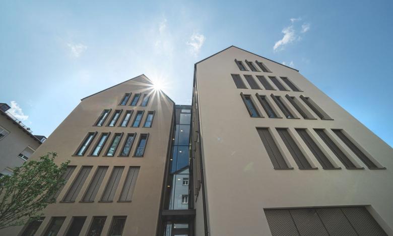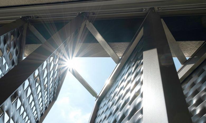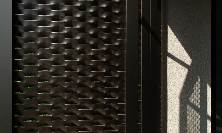 Der Bau stammt aus der Feder der Braunger Wörtz Architekten. Sie entschieden sich mit dem Faltscherenladen von Griesser für die Designikone unter den Fensterläden. Der Sonnenschutz ist nicht nur an der Fassade ein ästhetisches Highlight, sondern auch im Innern des Gebäudes. Die verschiedenen Öffnungswinkel sowie die Maschungen in den Paneelen erzeugen aussergewöhnlich schöne Licht- und Schattenspiele im Raum. Die Architekten wählten das beliebte Modell Sentum Slim, das über ein stilvolles Streckmetallprofil verfügt. Besondere Akzente setzen die Farben: Die Faltscherenläden sind in einem Bronze-Ton beschichtet, die Schienen und Blenden in einer eleganten tiefmatten Struktur.