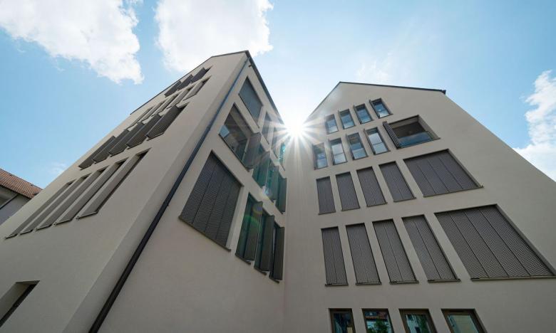 Das moderne Geschäfts- und Wohngebäude an der Gideon-Bacher-Strasse 3 in Ulm Mitte fügt sich in Form und Farbe perfekt in die Innenstadt ein. Trotzdem ist das aus drei Baukörpern bestehende Haus ein Blickfang, denn 424 Faltscherenläden von Griesser prägen die Fassade und verleihen ihr einen unverwechselbaren Charakter.
