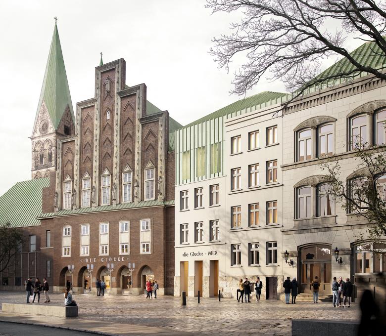 Das renommierte Konzerthaus „Die Glocke“ erweitert mit dem Neubau das Angebot musikalischer Erlebnisräume und festigt seine Stellung als kultureller Nukleus im Herzen der Stadt. Wir schlagen einen geometrisch klaren Baukörper vor, der über eine gläserne Fuge respektvoll an den historisch bedeutenden Altbau anschließt. Hier liegt auch das neue Eingangsfoyer. Zudem gibt es künftig optimale Bedingungen für die Durchführung von Workshops oder ähnlichen Veranstaltungsformaten. Weitere denkmalgeschützte Gebäude werden in das Ensemble integriert.