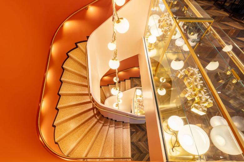 Die Treppe wurde im Zuge des Umbaus von der Außenwand ins Gebäudeinnere versetzt und führt nun von dort als geschwungenes Terrazzo-Band in die oberen Stockwerke. Im Auge des neuen Stiegenlaufes zieht sich ein auffälliger Luster, ähnlich einer leuchtenden Muschelkette, über alle drei Geschosse.