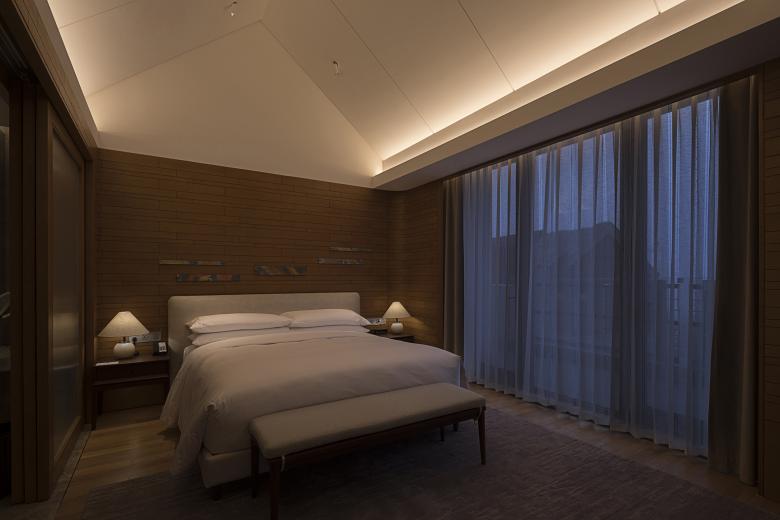 Combined with the inwardly recessed herringbone overhang structure of the guest room building, PROL sets the lighting points in the recessed position of the eaves and the interior of building. Although there is no visible light source on the top and façade of the building, the light spilling over the eaves and corners inadvertently outlines and renders the simple and elegant shape and texture of the eaves and walls.